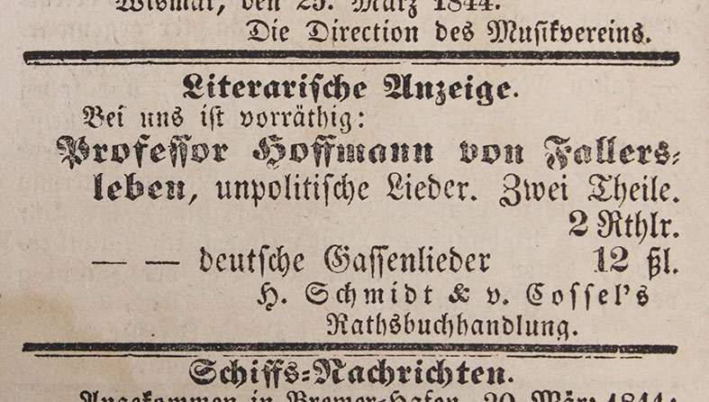 Das „Lied der Deutschen“ – unsere heutige Nationalhymne – ist eines der bekanntesten dieser Protestlieder. Das 1841 von Hoffmann von Fallersleben auf Helgoland geschriebene Lied mit einer 1797 komponierten Melodie von Joseph Haydn, verbreitete sich schnell über ganz Deutschland. In Rostock singen es Handwerker 1845 ihm als Ständchen. Im Lied spiegelt Hoffmann die Sehnsucht vieler Deutscher nach nationaler Gemeinschaft, die nicht durch kleinstaatliche Grenzen zersplittert sein soll. Dabei besingt er Deutschland in seinen damaligen Außengrenzen ohne Ansprüche auf Gebietserweiterungen. Ihm geht es um die Menschen, die darin leben und sich nach „Einigkeit und Recht und Freiheit“ sehnen.