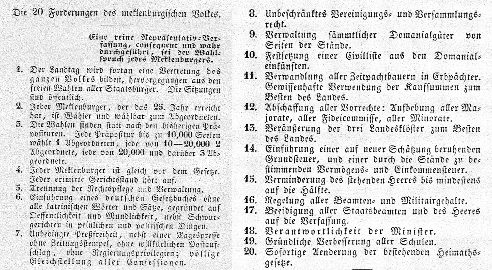 Nach den Revolutionen in den deutschen Ländern wird fast überall eine konstitutionelle Monarchie eingeführt, bei der die Fürsten und Könige ihre Ämter behalten, gewählte Vertreter in bürgerlichen Parlamenten aber Mitspracherecht bekommen. Nur Mecklenburg-Schwerin, Mecklenburg-Strelitz und Schaumburg-Lippe bleiben ohne Parlament. Für Mecklenburg gilt wieder der „Landesgrundgesetzliche Erbvergleich“ von 1755. Fritz Reuter fasst das 1860 satirisch zusammen: „§ 1 Allens bliww‘t bi‘n Ollen. § 2 Wenn sick de Pierdjungens, Schepers un Kauhirders slagen willen, känen sei dat dauhn, un keiner hett sick dor mang tau stecken. § 3 (fehlt). § 4 (item) usw.“