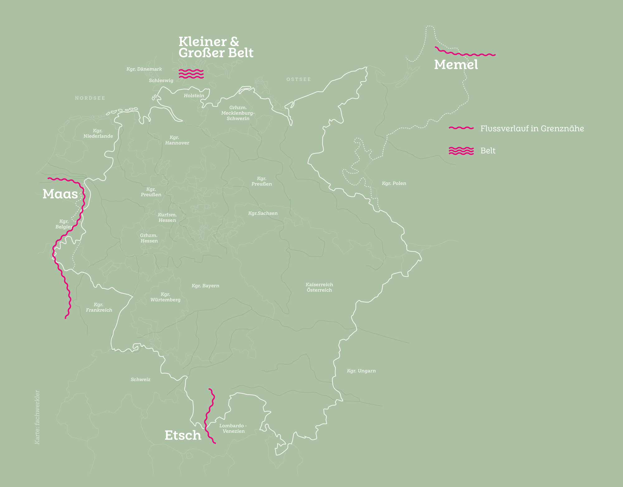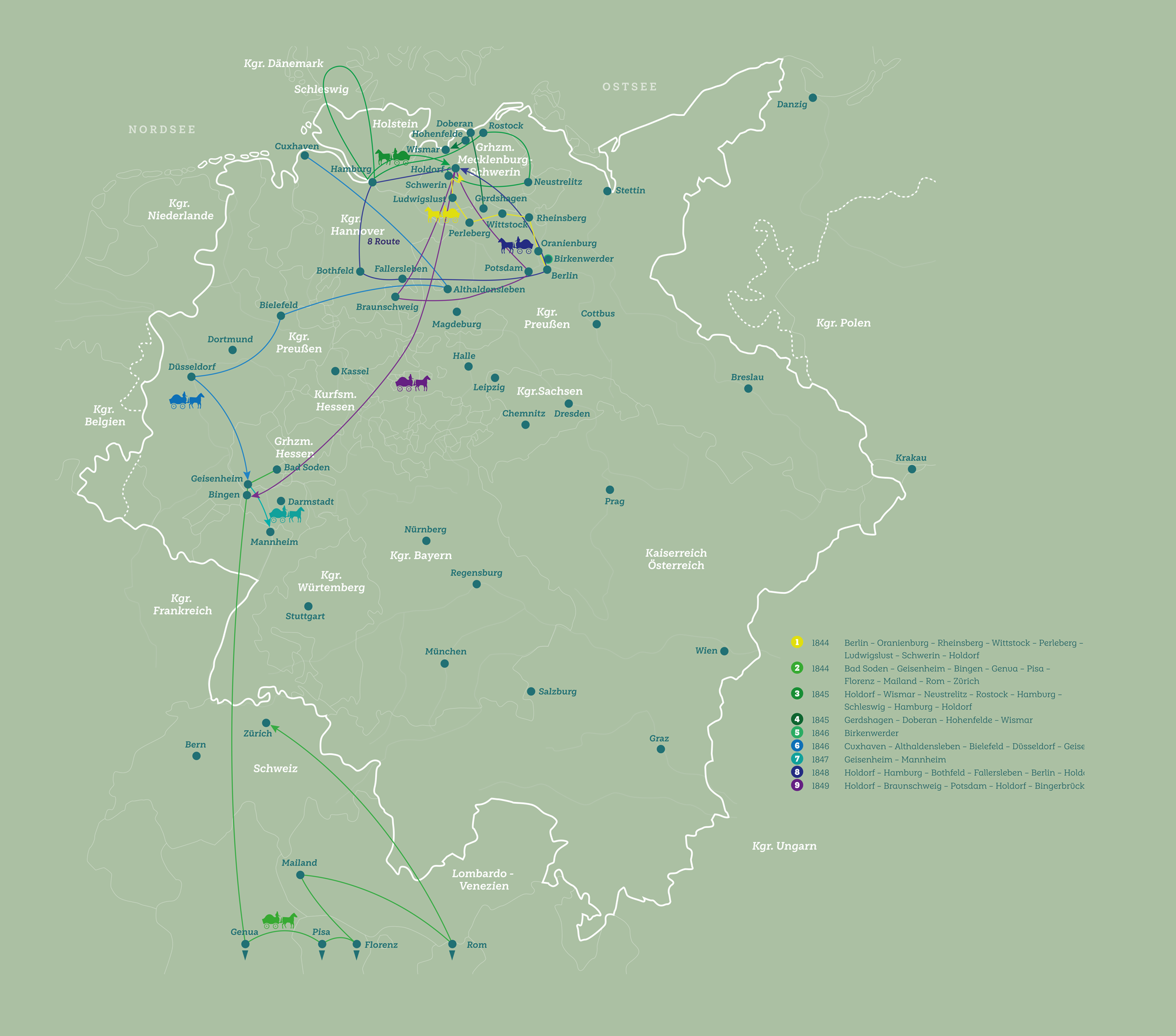 Die Karte des zersplitterten Deutschlands gleicht 1845 einem Flickenteppich. 36 souveräne Einzelstaaten wachen eifersüchtig über ihre Territorien. Hoffmann von Fallersleben will diese Grenzen beseitigen. Deshalb reist er auch während seines Asyls in Mecklenburg kreuz und quer durch Deutschland, bis in die Schweiz und nach Italien, um aus seinen „Unpolitischen Liedern“ vorzulesen, Vorträge zu halten und sich mit Gleichgesinnten zu treffen.